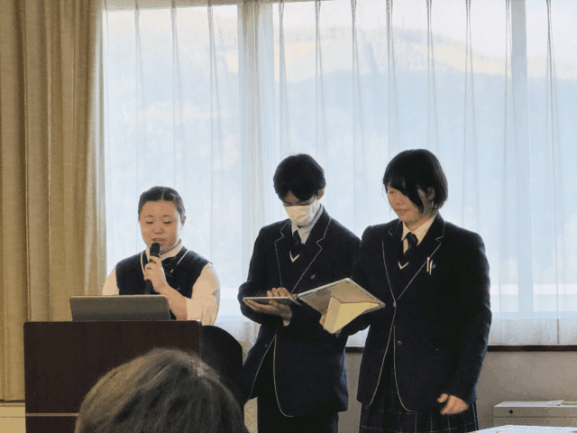 函館・室蘭・札幌・旭川・北見の7校のミッションスクールの生徒が一同に集まる「北海道カトリック学校生徒全道大会」に参加した長野、松本、高杉さん。