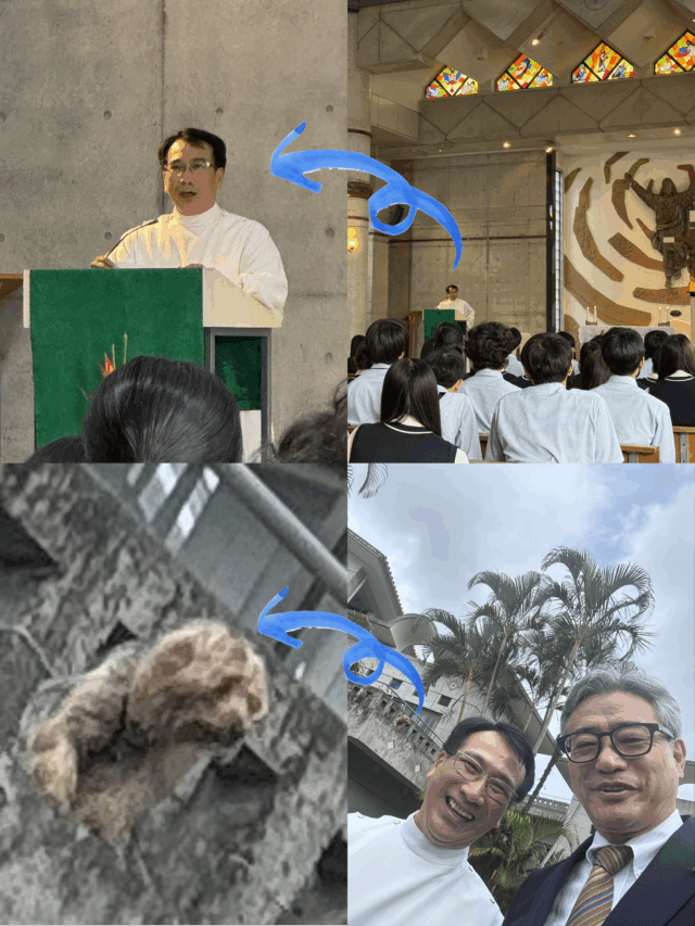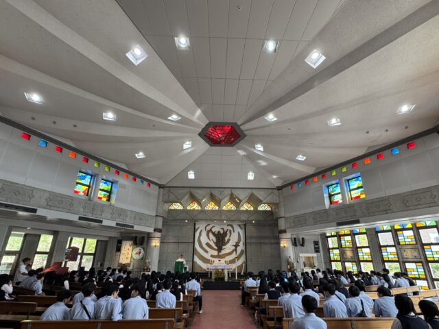 NEW修学旅行(祈る) 2025年10月27日 / News, 学校行事 / By 校長 修学旅行で安里(あさと)教会を訪問しました。主任司祭のブイ・ヨゼフ神父さまの話しを伺い、生徒たちは改めて平和を願う気持ちが強くなったようです。全員で唱えた「主の祈り」のとおり、みこころが天に行われるとおり地にも行われますように。(校長)
