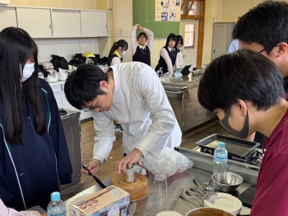 美幌の食堂「らぐ~」の経営者、野口さん(写真中央)の指導の下、先日藤高校の畑で収穫された小豆を用いて、2年生フロンティアコースおよびグロリアコースの生徒が菓子作りに挑戦しました。