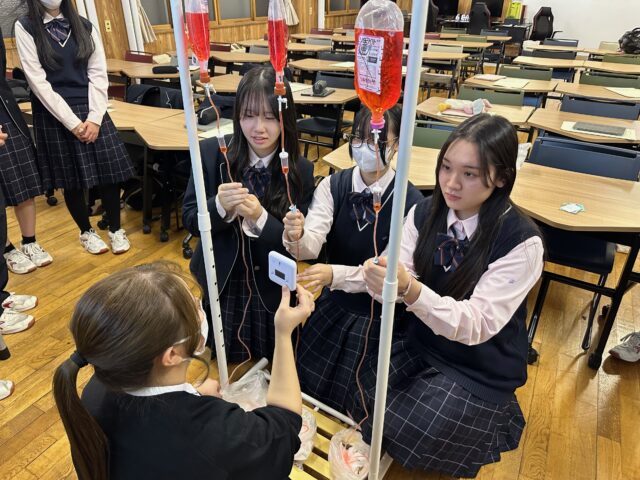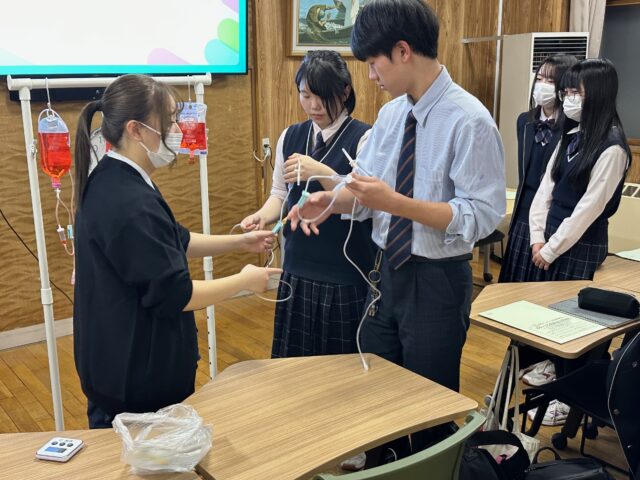 また、オペ室で使用される滅菌手袋の装着や点滴の調整など、看護師の業務を体験する機会も設けられました。生徒たちは、体験内容に苦戦しながらも、熱心に取り組んでいました。
