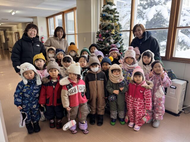 NEW天使あらわる 2025年12月11日 / News, フジコウの魅力 / By 校長 北見藤幼稚園の園児たちがクリスマスカードを届けてくれました。道路が滑るなか歩いて来た園児たちは疲れた顔をしていましたが、ツリーを見ると元気が戻ったようです。ありがとうございます、またお越しくださいね。(校長)