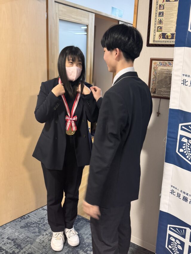 「当たるとやっぱり痛いですよ」と言っていたので、お腹触らせてもらいましたが、ガッチガチでした。担任の髙津先生は金メダルを掛けてもらい嬉しそうでした。おめでとう!(校長)