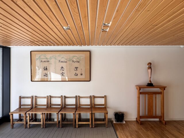 生徒玄関を入ると、左側には北見藤女子高校から続く校訓「謙遜・忠実・潔白」の額と木製の像、長らく倉庫に保管されていた創立当時の椅子があります。