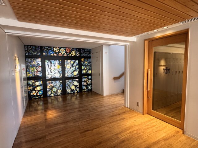 正面奥には、これも北見藤女子高校の時に美術部を中心に有志が作成したステンドグラス風の飾りを移設してあります。(校長)