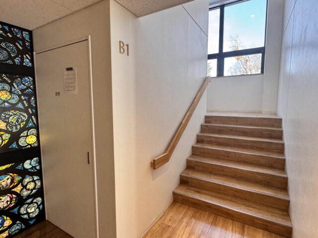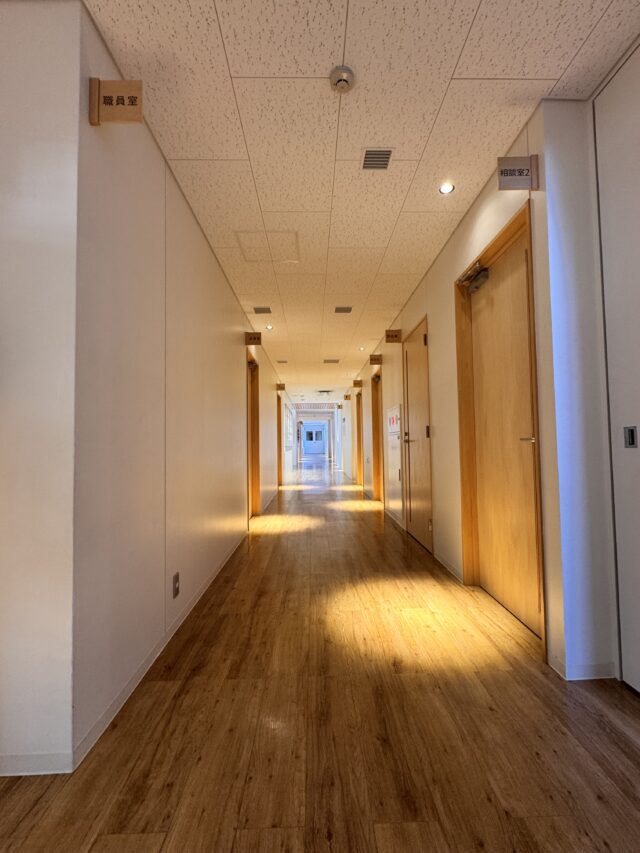 地下の生徒玄関から1階に上がると、職員室・校長室・事務室・保健室・応接室・相談室などがあります。
