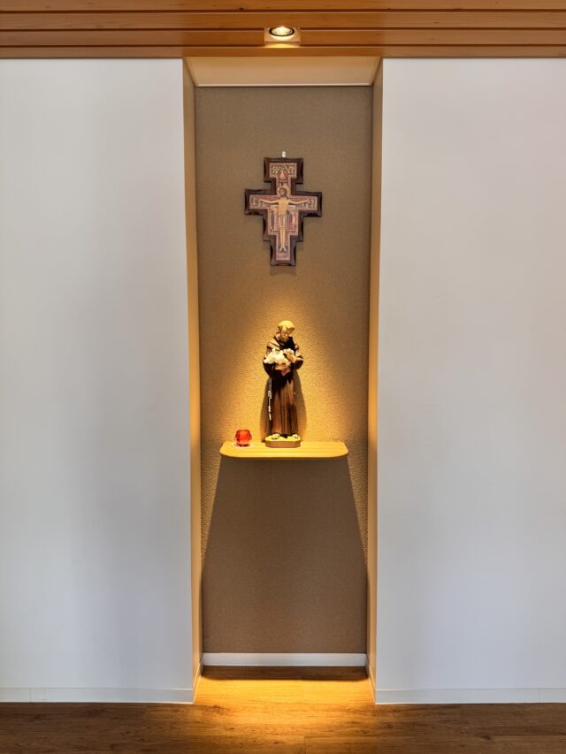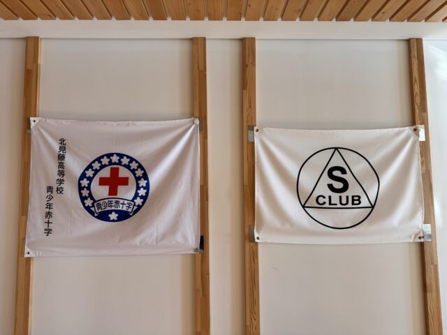 職員玄関から入った所には「Sクラブ」と「青少年赤十字」の旗が掲げられ、カトリック校ならではの像がお客様をお迎えしています。