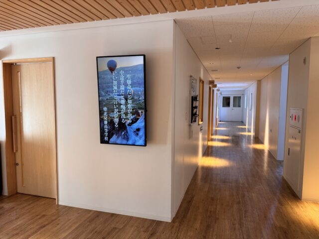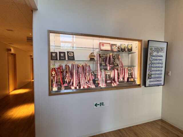 2つのデジタルサイネージには部活動の速報やお知らせなどの情報が流されています。サイネージ横の棚には部活動のトロフィーが所狭しと並べられています。(校長)