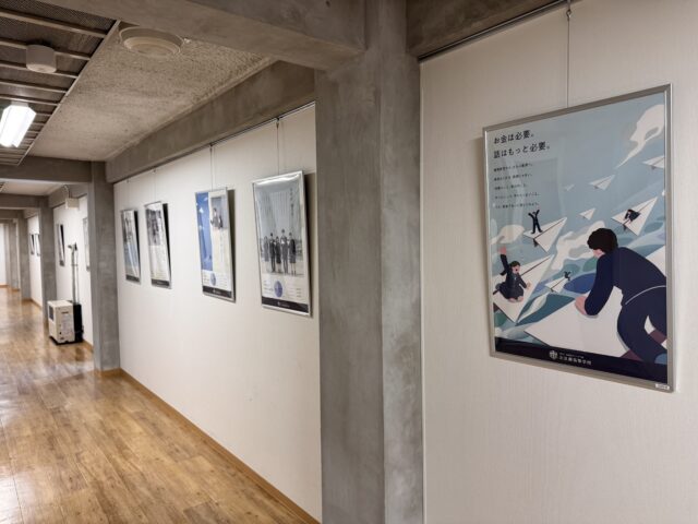 NEW校舎紹介7 2026年1月16日 / News, フジコウの魅力 / By 校長 新校舎棟から体育館へ繋がる廊下には歴代の美術部員が残していった絵画や、2018年以降の学校ポスターが飾ってあります。体育館前にも飲料の自動販売機が設置してあり、非常時の水分補給にも備えています。(校長)