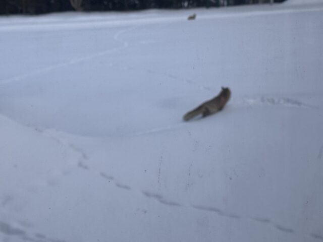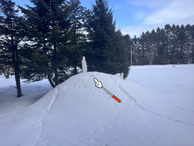 うっすらと雪が積もっている裏庭のマリア像。指示棒のあたりにキタキツネが昼寝していました。