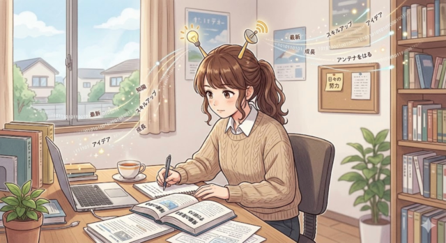 ところで、AIに「良いものを取り入れるよう、日々アンテナを張って勉強を続ける様子をイラストにして。」と頼んだら、下のイラストになりました。「AI、まだまだですね。」(校長)