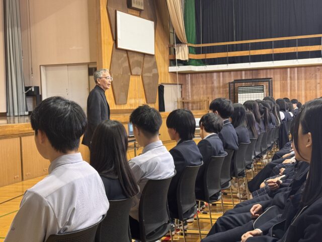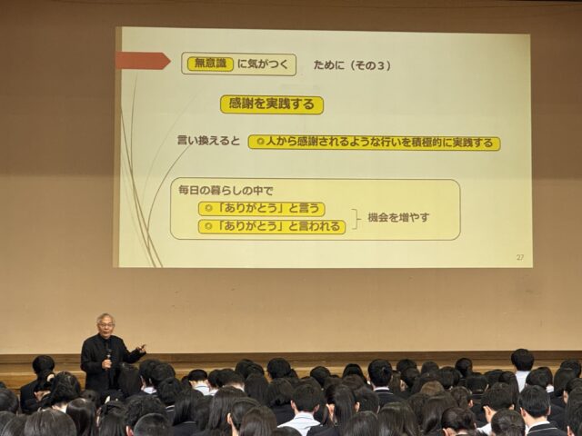 NEW「無意識」に気がつく 2026年4月24日 / News, 学校行事 / By 校長 今週の宗教の時間に、塩見啓一先生をお迎えして講話を実施しました。「深呼吸をする、感謝を実践する、無意識を磨く」講話を聞いた藤高生なら、わかりますよね。次回、「愛とは、夢とは、優しさとは、ときめきとは」。乞うご期待!(校長)