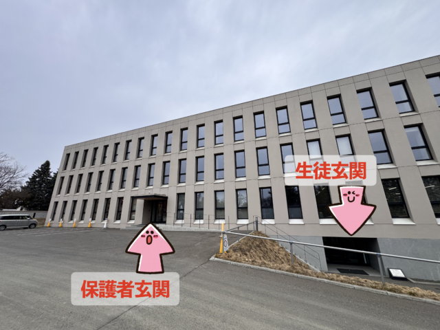 4月3日の新入生オリエンテーションですが、新入生はもちろん、保護者の方にも学校にお入りいただけます。新入生は下の生徒玄関、保護者の方は上の職員玄関からお入り下さい。
