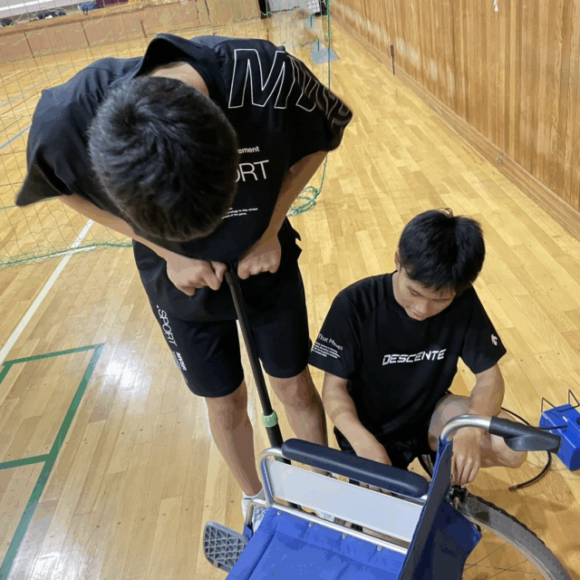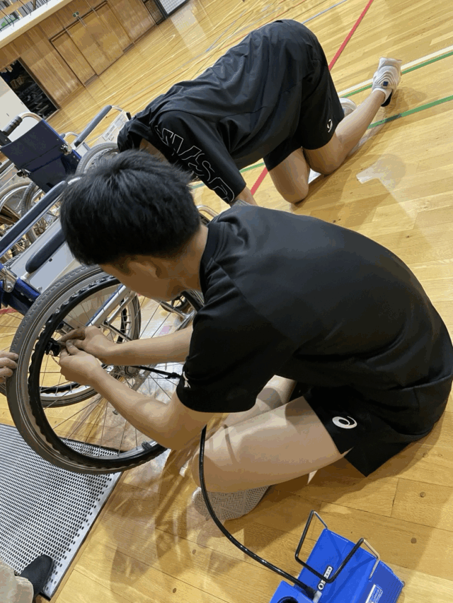 翌日、車椅子の体験学習があるため、空気が抜けたタイヤを自主的に整備してくれた1年生の山田さん、川村さん、ありがとう!