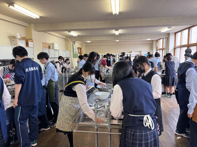 美幌の食堂「らぐ~」の経営者、野口さん(写真中央)の指導の下、先日藤高校の畑で収穫された小豆を用いて、2年生フロンティアコースおよびグロリアコースの生徒が菓子作りに挑戦しました。